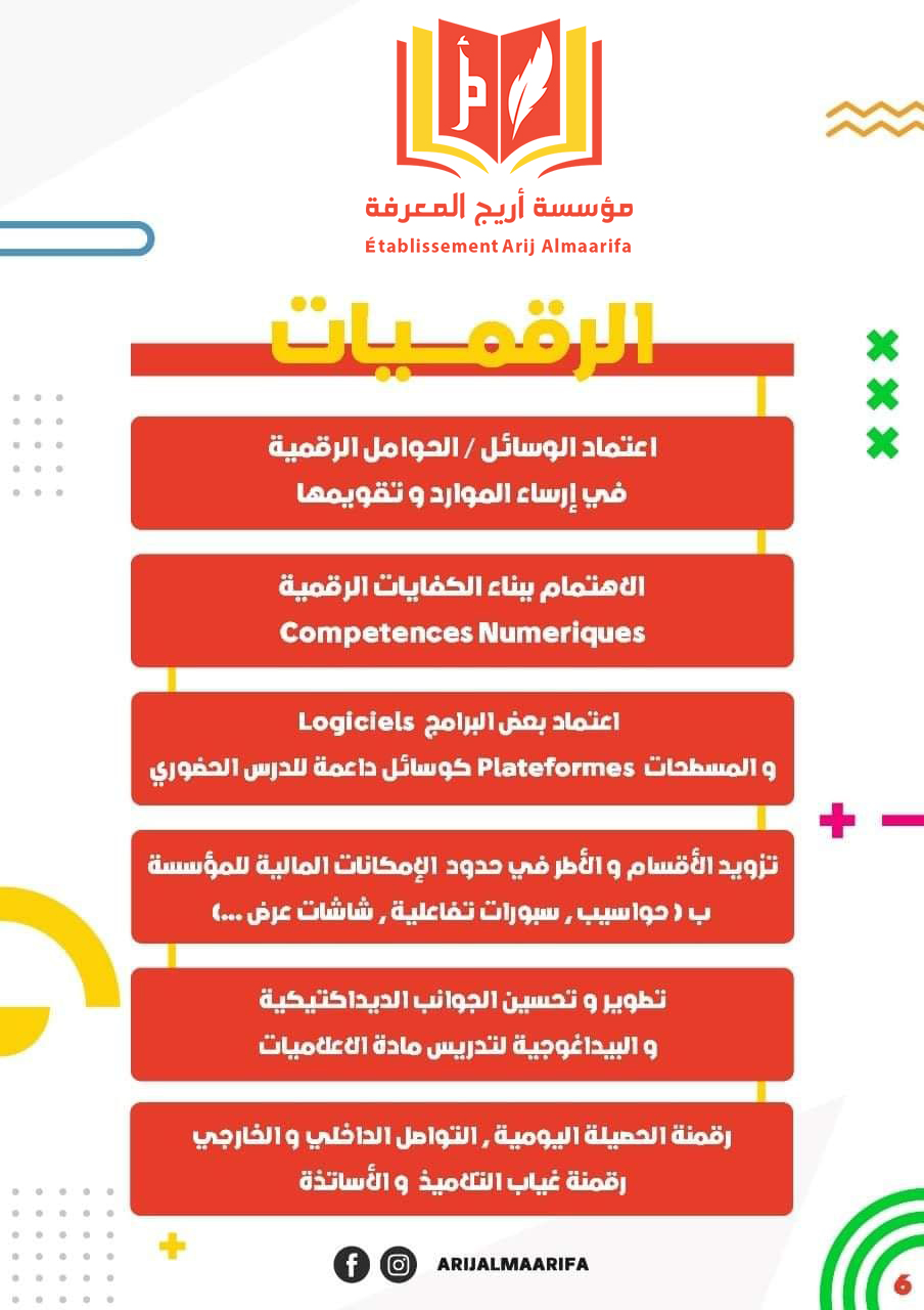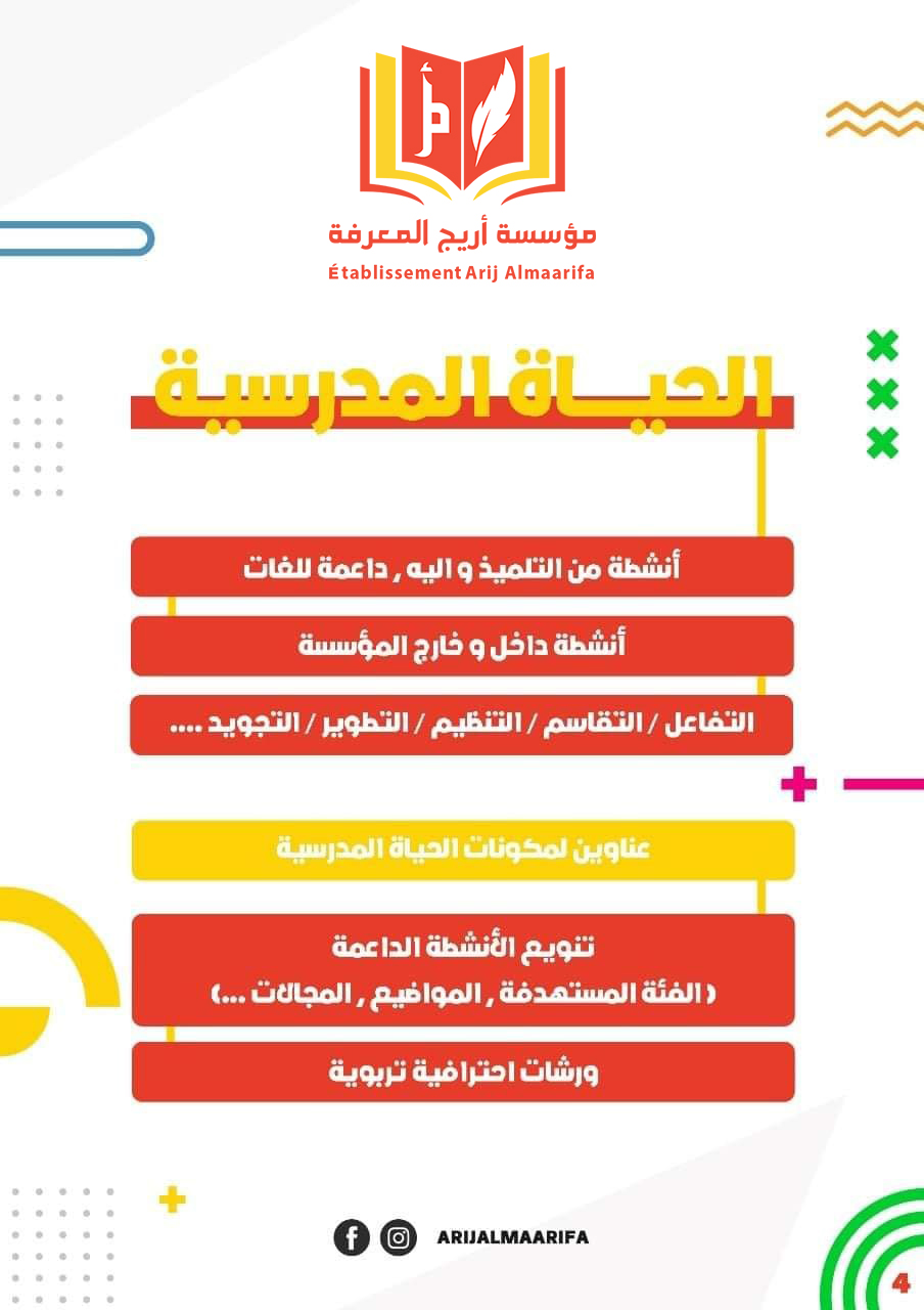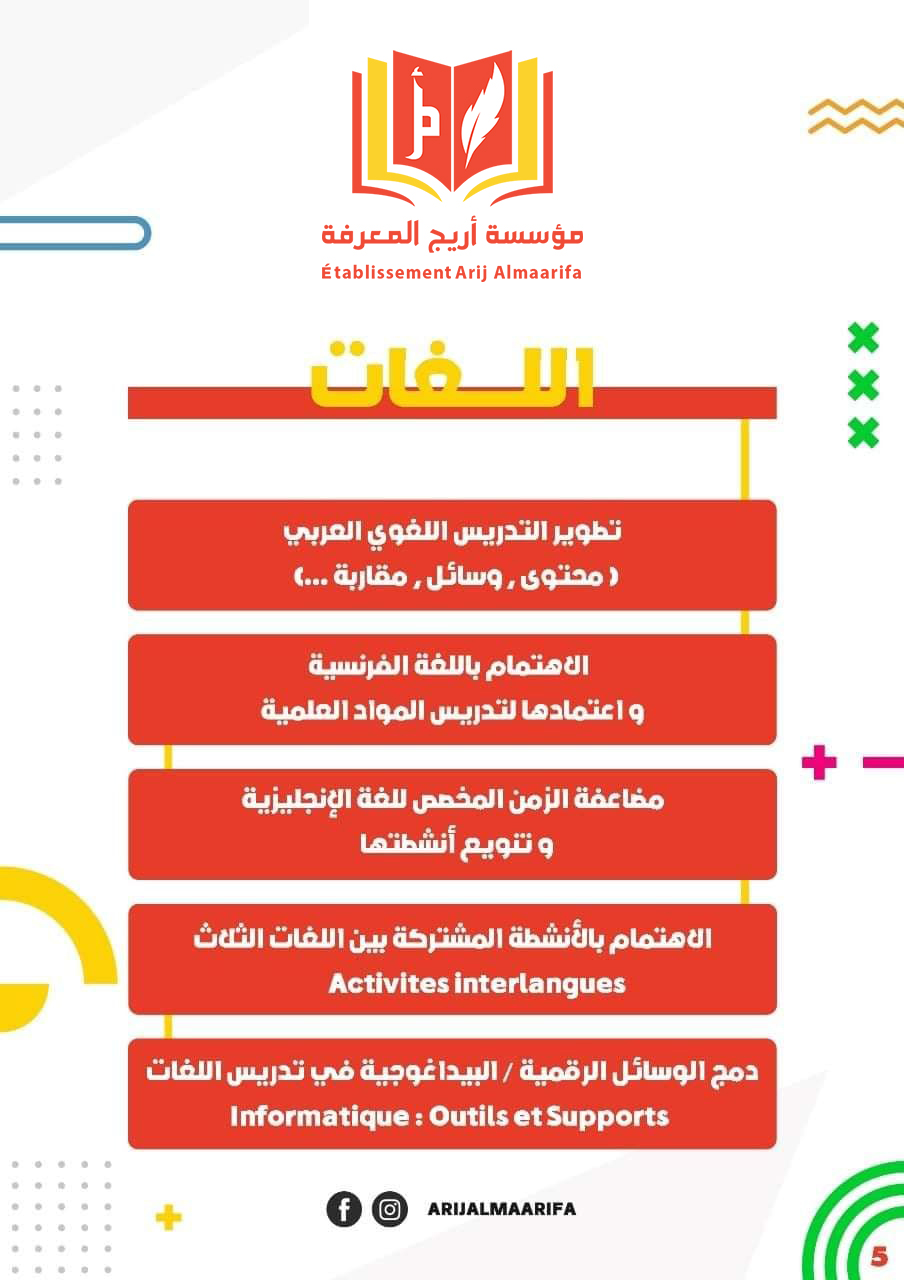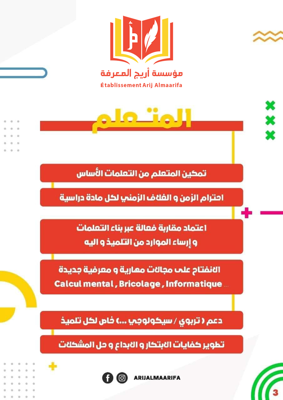 La Fondation Arij AlMaarifa est un établissement d'enseignement qui s'efforce de fournir une structure éducative intégrée et d'établir Un projet pédagogique distingué visant à diversifier et enrichir l'offre pédagogique, et à développer la pratique De manière efficace et selon des approches pédagogiques actives centrées sur les intérêts et les besoins de l'élève